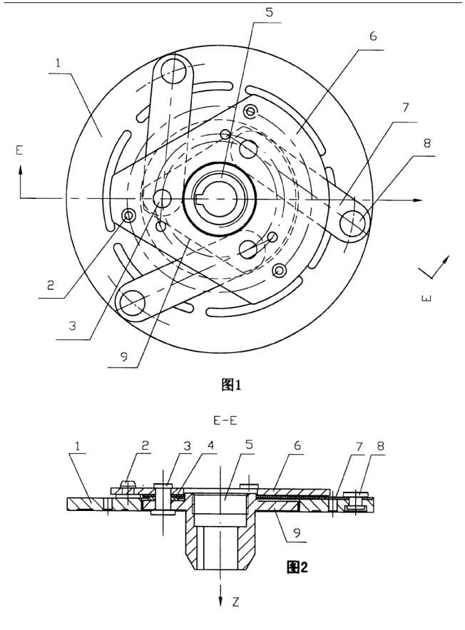 具体实施方式:如图1所示是本装置的衔铁的主视图,它主要由吸盘1、轮毂5、三个簧片7、驱动板6组成,驱动板6上设有三个消音塞2,每个簧片7用外铆钉8铆接于吸盘1上;簧片7及内、外铆钉3、8的位置是吸盘中心对称设置的,轮毂5上设有配重键盘9,驱动板6、配重键盘9的法兰面为非对称一大一小的扇形结构,目的是为了给压缩机系统平衡配重。如图2所示,驱动板6、簧片7、垫片4及配重键盘9用内铆钉3铆接联接,配重键盘9沿轮毂5的轴向Z向下移动3-5mm,位于吸片圆孔中,这样可减小驱动板6的配重量及面积,使吸片整体中心下移,即缩短了电磁离合器与压缩机的轴向距离,减小了压缩机主轴运转时的弯矩,在压缩机高速运转的状态下,电磁离合器重心微小的前移使压缩机弯矩减小,对减小震动及噪音的影响都是巨大的。