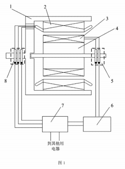 图1为馈能型电磁转差离合器的结构示意图,馈能型电磁转差离合器包括电磁转差离合器、能量回收装置、励磁电路和控制器组成,电磁转差离合器包括外转子1、内转子4、三相绕组电刷8、励磁绕组电刷5。外转子1上的三相绕组2与三相绕组电刷8相连,内转子4上的励磁绕组3与励磁绕组电刷5相连,能量回收装置7与三相绕组电刷8连接,控制器6分别与能量回收装置7以及励磁绕组电刷5相连,能量回收装置7还与其他用电器相连。