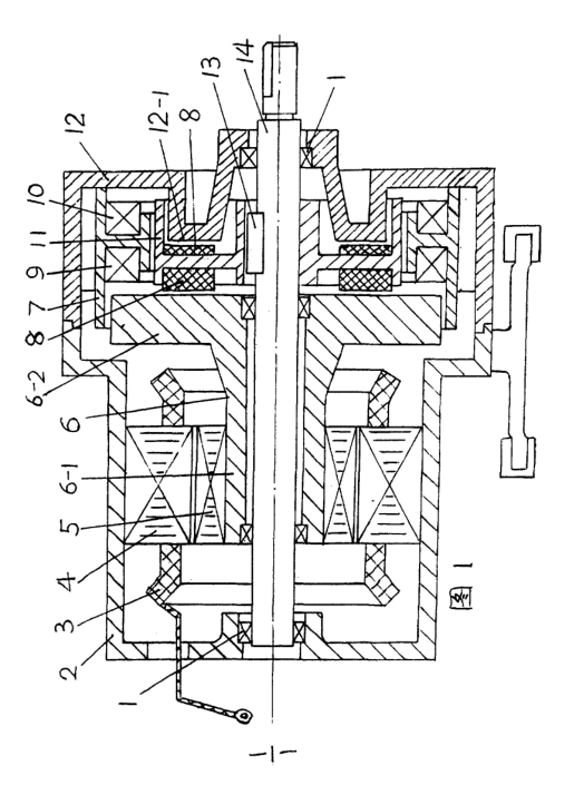 在图4中,1轴承,2机壳,3定子绕组,4定子,5转子,6飞轮,7-1前磁轭,7-2后磁轭,8摩擦块,9前激磁绕组,10后激磁绕组,11-1前活动盘,11-2后活动盘,12前端盖,13离合部分中带花键的导轴,14电机部分的转轴,15导磁盘,16前盖