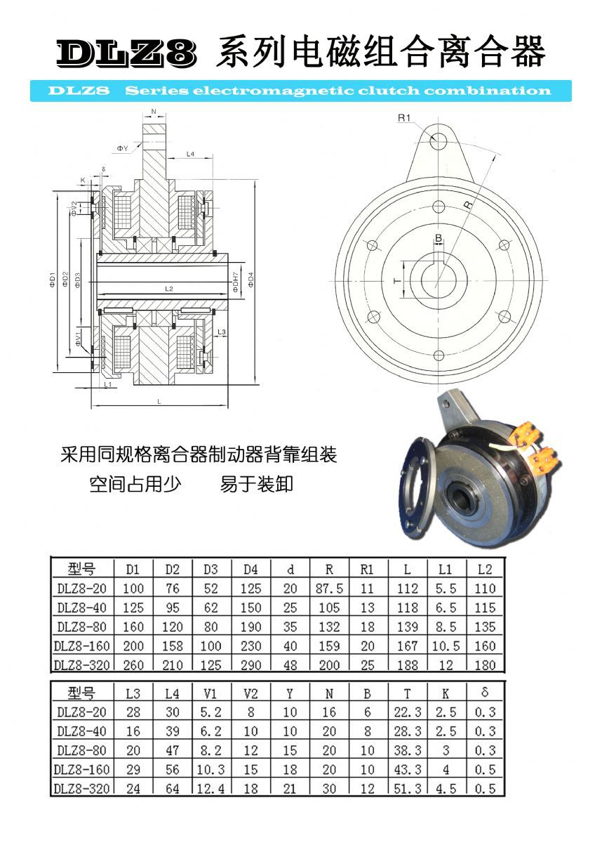 采用铝合金本体,离全器与制动器背贴安装,佔地空间小,安装方便,入力侧可安装飞轮,出力侧则在套筒轴上,易于拆卸。